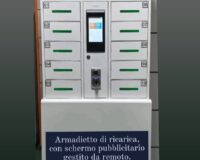 Armadietti di ricarica rapida per cellulari, con schermo video pubblicitario e gestione da remoto.